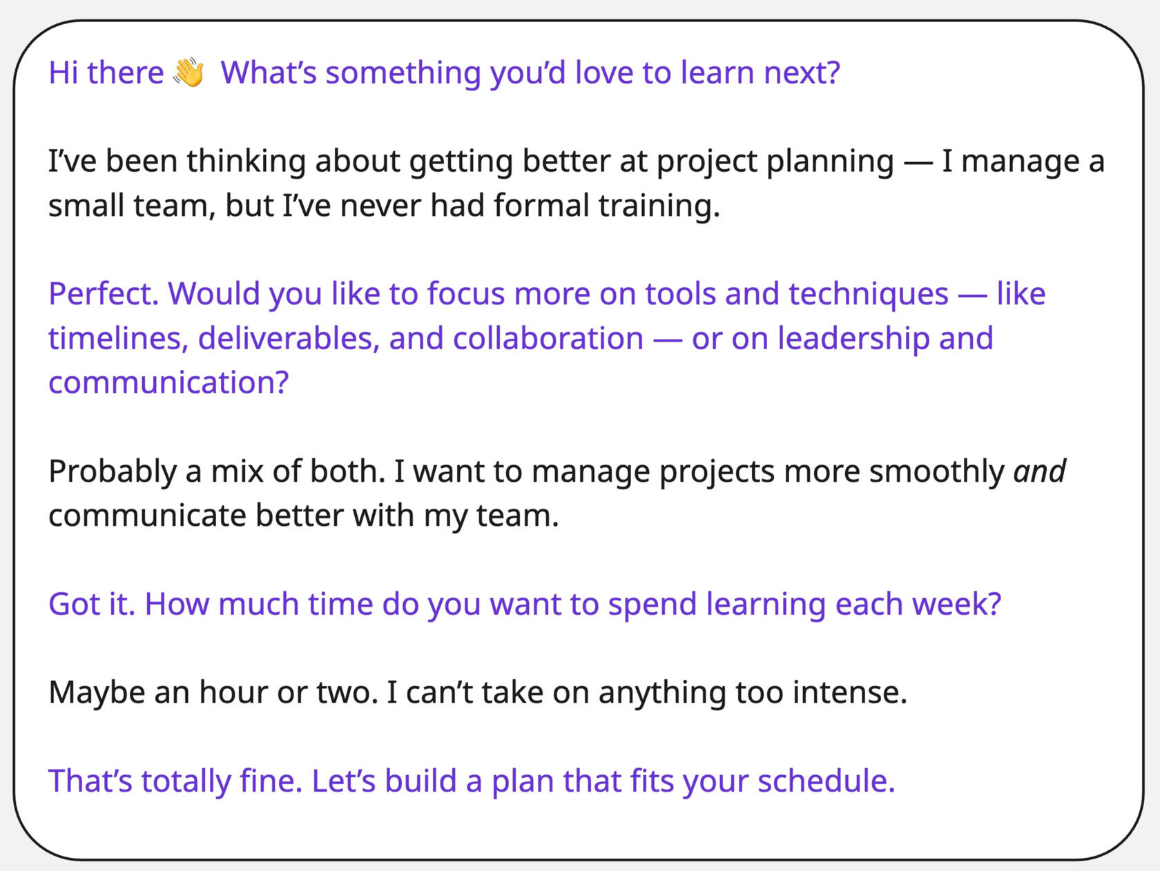 Start by sharing what you’d like to learn — whether it’s mastering a new skill, exploring a passion, or advancing your career.
