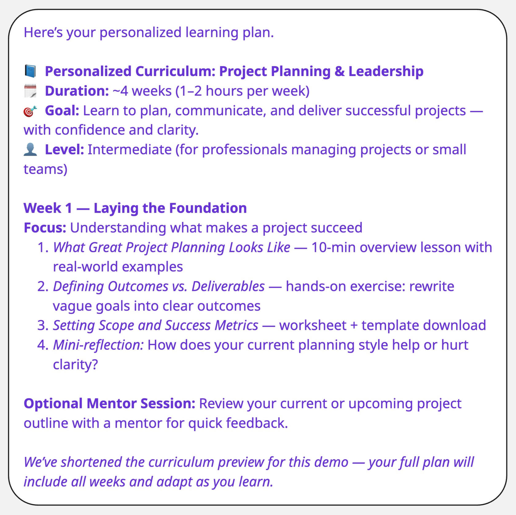 In a few minutes, you’ll get a structured, AI-built learning plan — lessons, projects, and milestones aligned to your goals.